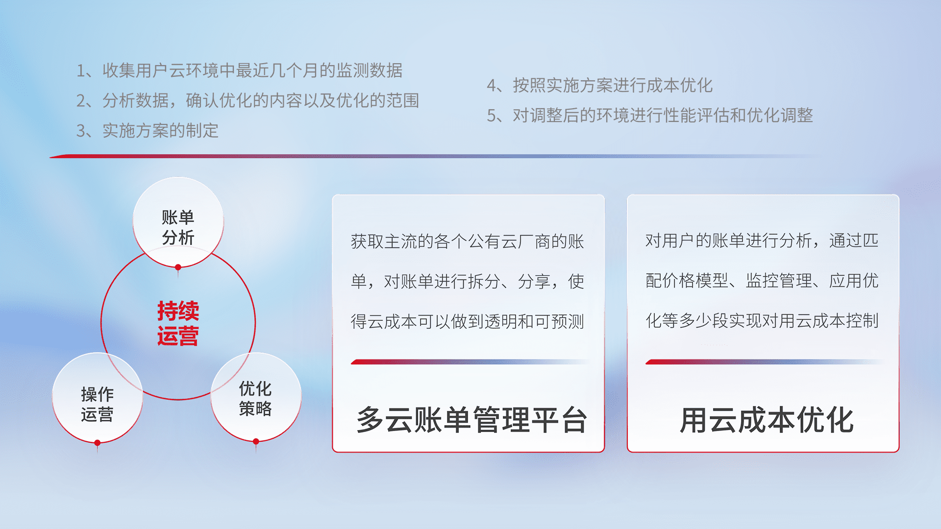 通过多云纳管,,,以统一的资源数据模型把客户的云资源进行抽象和封装,,,,进而实现对多云资源的统一操作,,保障云资源管理的可靠性、、、、稳定性与可用性。。。量身定制化运维内容,,,,配置、、、、开发运维、、、补丁管理、、、备份、、、监控、、、认证和访问管理、、、、审计和日常巡检等,,,,保障在用云过程中的可靠度,,,稳定度以及高可用率。。。。